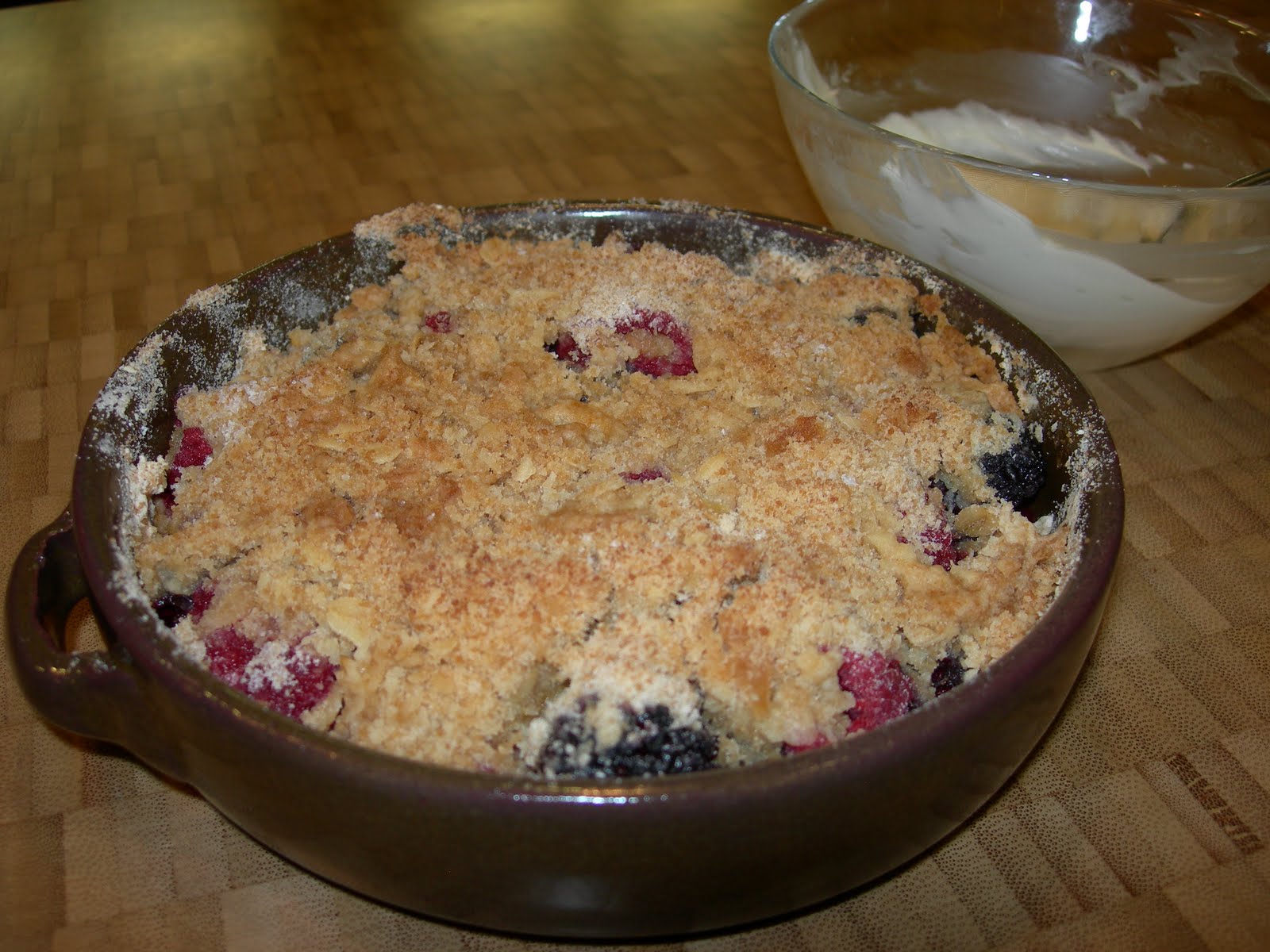 3. Sprinkle the berries with this mixture. Bake at 400ºF. for 20-25 minutes until golden brown and bubbling. Serve warm with one of the suggested toppings.